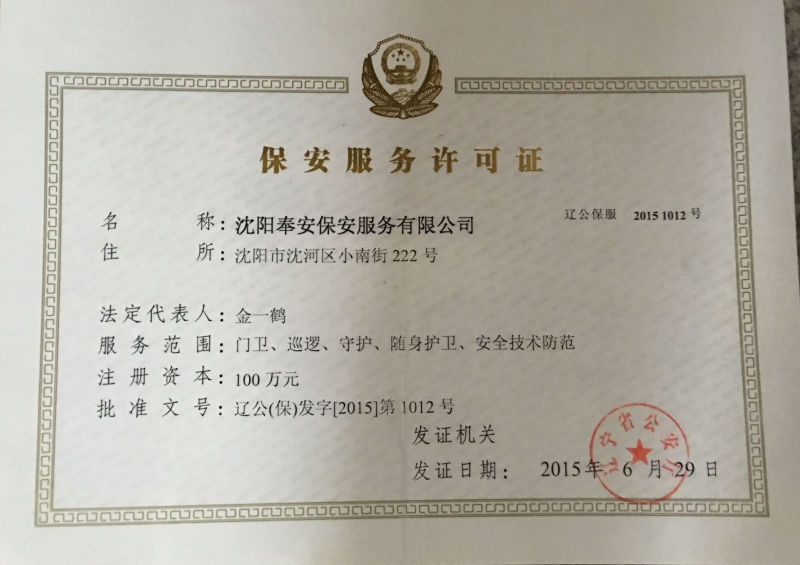 沈陽奉安保安服務(wù)有限公司(原沈陽市沈河區(qū)保安服務(wù)公司)創(chuàng)建于一九八八年八月,是遼寧省公安廳、沈陽市公安局批準(zhǔn),工商行政部門登記注冊(cè),全市首家具備保安資質(zhì)的特殊性服務(wù)企業(yè),隸屬于沈陽市沈河區(qū)政府直管的全民國有企業(yè),現(xiàn)為中國保安協(xié)會(huì)會(huì)員單位和省保協(xié)、市保協(xié)常務(wù)理事單位:在全市同行業(yè)中率先通過ISO國際質(zhì)量認(rèn)證,是市工商局批準(zhǔn)的“重合同守信用”免檢單位和沈陽市政府采購中心保安服務(wù)項(xiàng)目重點(diǎn)競(jìng)標(biāo)單位;擁有一支專業(yè)化、標(biāo)準(zhǔn)化、職業(yè)化的高素質(zhì)保安隊(duì)伍,是公安機(jī)關(guān)重要的輔警力量。